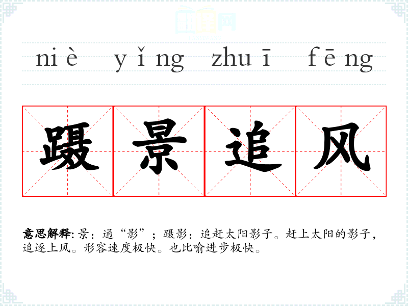景:通“影”;蹑影:追赶太阳影子。赶上太阳的影子,追逐上风。形容速度极快。也比喻进步极快。