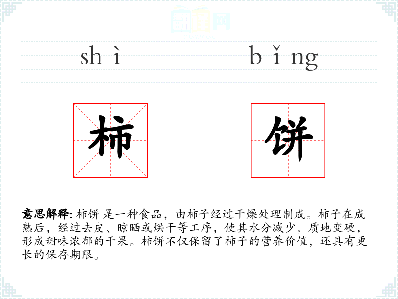 - 反义词:新鲜柿子。新鲜柿子是柿饼的原料,两者在口感和保存方式上有明显区别。