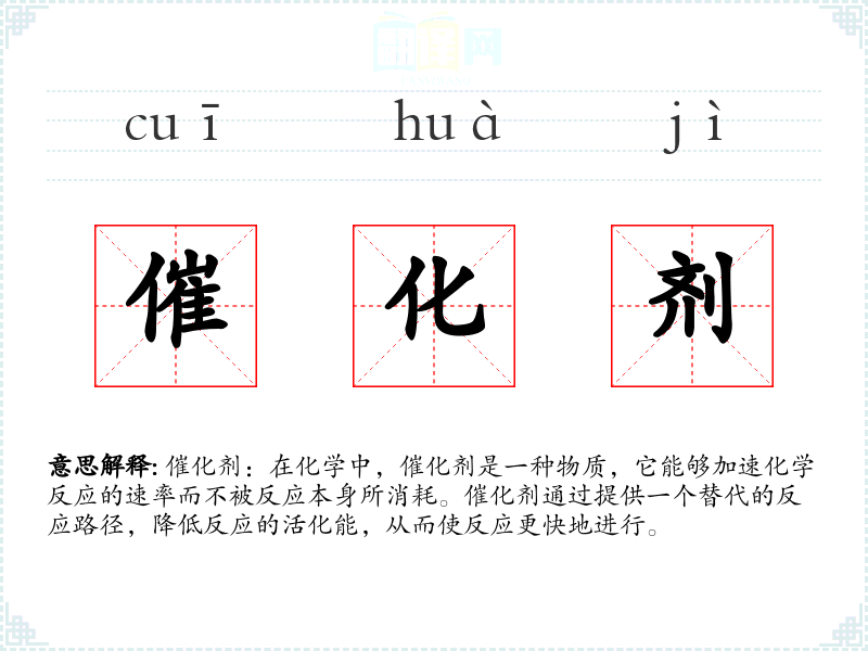 - 专业领域:在化学、生物化学和材料科学等领域,“催化剂”是一个核心概念,用于描述和研究加速化学反应的物质。