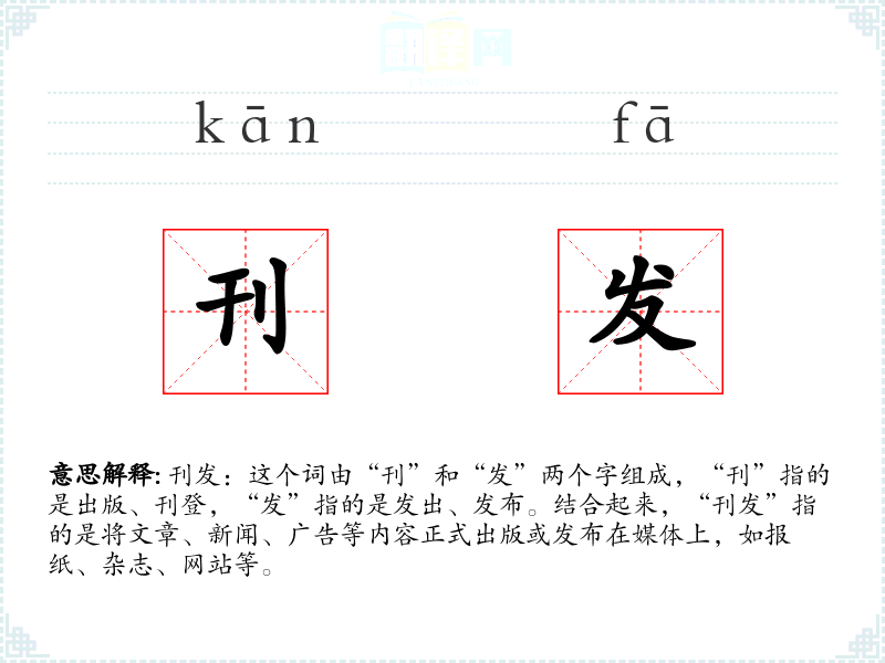 刊发:这个词由“刊”和“发”两个字组成,“刊”指的是出版、刊登,“发”指的是发出、发布。结合起来,“刊发”指的是将文章、新闻、广告等内容正式出版或发布在媒体上,如报纸、杂志、网站等。