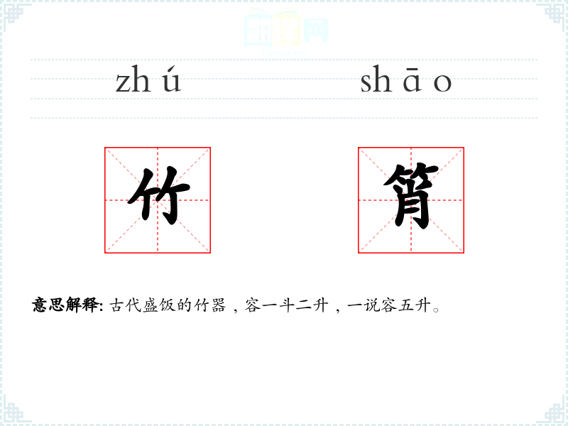 古代盛饭的竹器﹐容一斗二升﹐一说容五升。