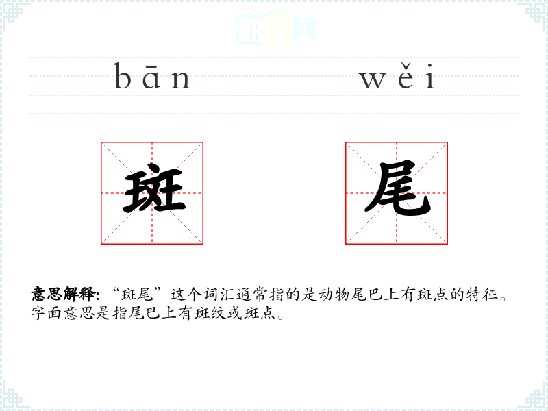 “斑尾”这个词汇通常指的是动物尾巴上有斑点的特征。字面意思是指尾巴上有斑纹或斑点。