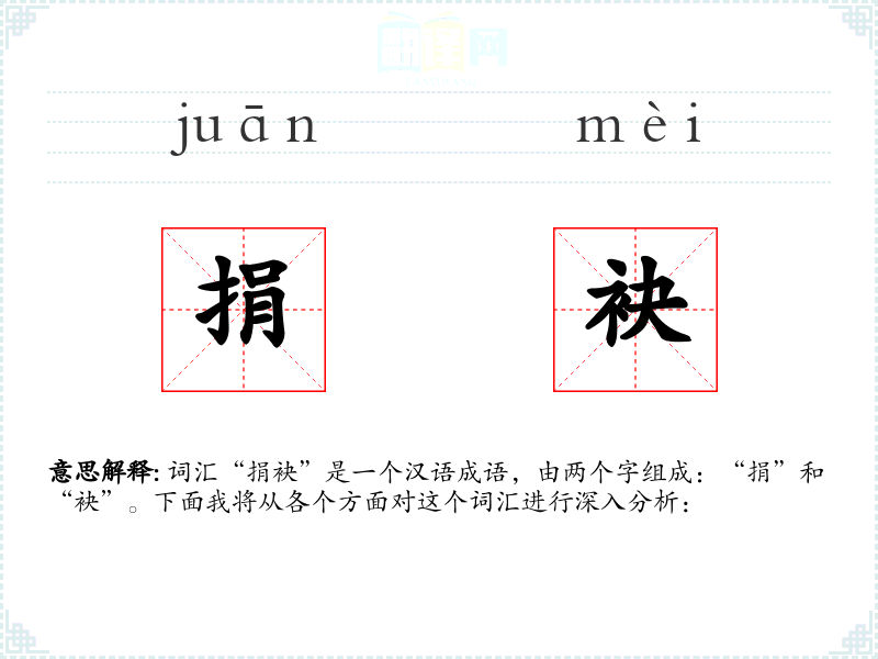 词汇“捐袂”是一个汉语成语,由两个字组成:“捐”和“袂”。下面我将从各个方面对这个词汇进行深入分析: