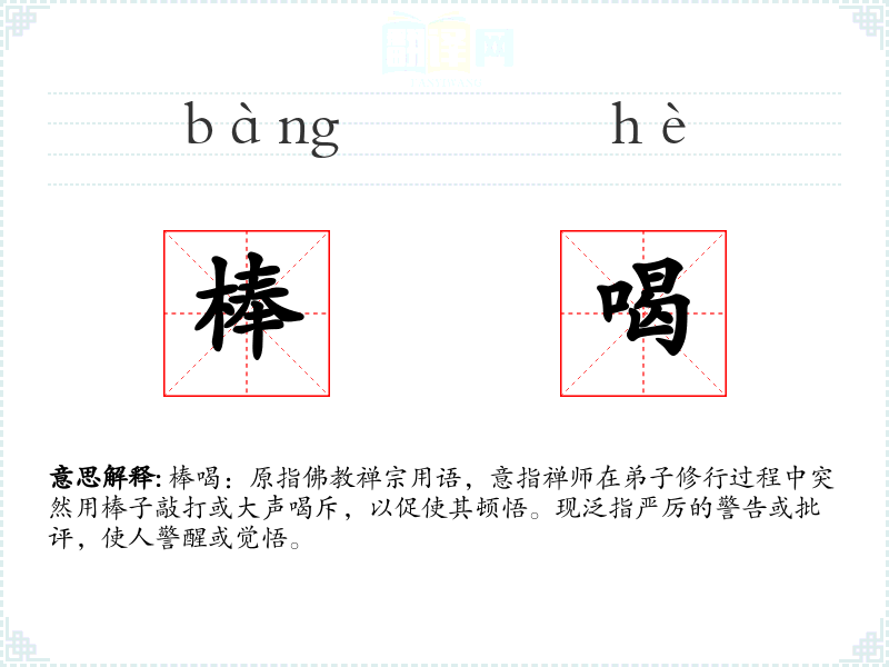 棒喝:原指**禅宗用语,意指禅师在弟子修行过程中突然用棒子敲打或大声喝斥,以促使其顿悟。现泛指严厉的警告或批评,使人警醒或觉悟。