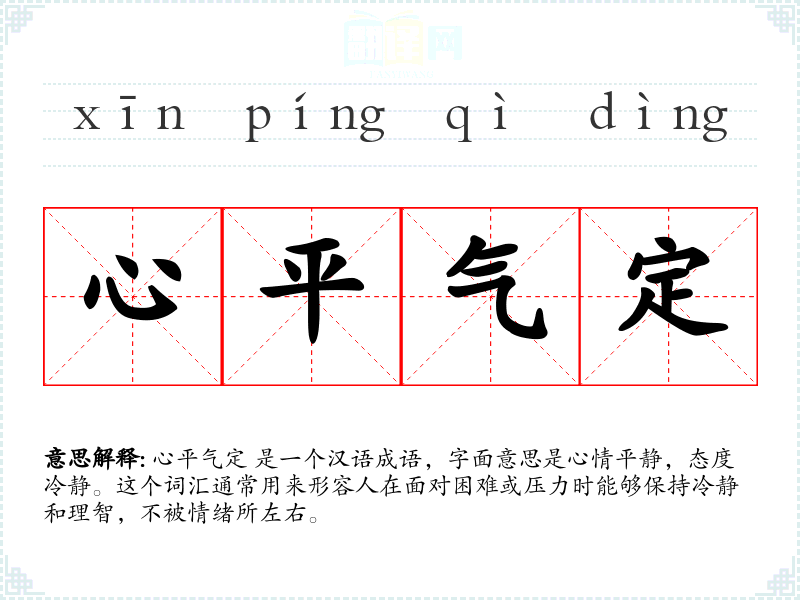 心平气定 是一个汉语成语,字面意思是心情平静,态度冷静。这个词汇通常用来形容人在面对困难或压力时能够保持冷静和理智,不被情绪所左右。