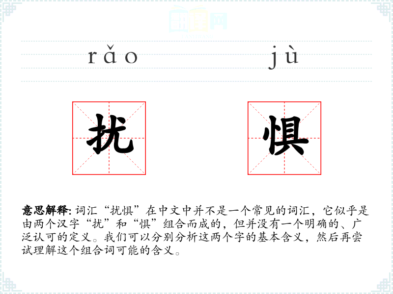 词汇“扰惧”在中文中并不是一个常见的词汇,它似乎是由两个汉字“扰”和“惧”组合而成的,但并没有一个明确的、广泛认可的定义。我们可以分别分析这两个字的基本含义,然后再尝试理解这个组合词可能的含义。