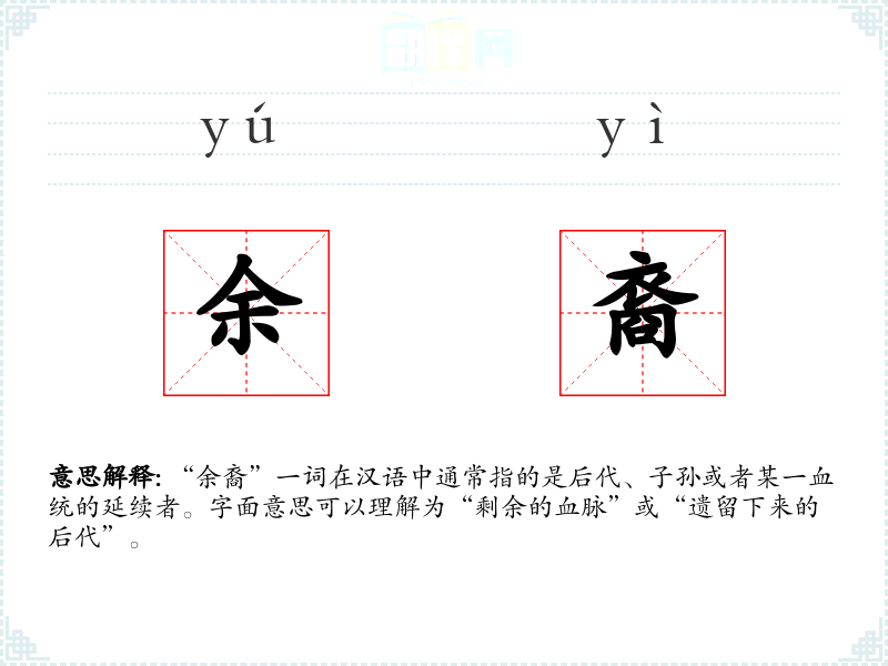 “余裔”一词在汉语中通常指的是后代、子孙或者某一血统的延续者。字面意思可以理解为“剩余的血脉”或“遗留下来的后代”。
