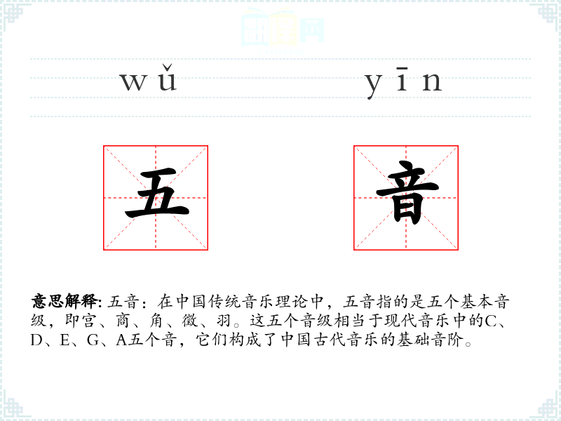 - 口语:在日常对话中,五音可能不太常用,但在讨论**传统音乐或文化时会被提及。