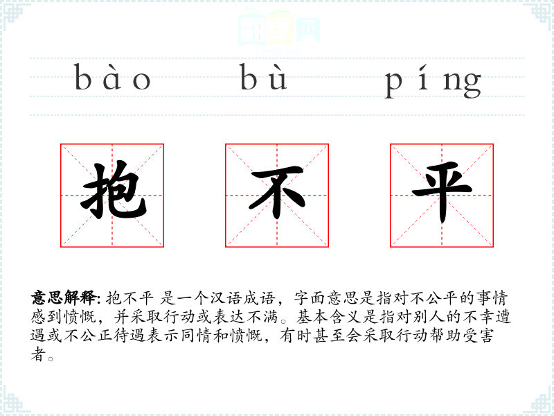 抱不平 是一个汉语成语,字面意思是指对不公平的事情感到愤慨,并采取行动或表达不满。基本含义是指对别人的不幸遭遇或不公正待遇表示同情和愤慨,有时甚至会采取行动帮助受害者。
