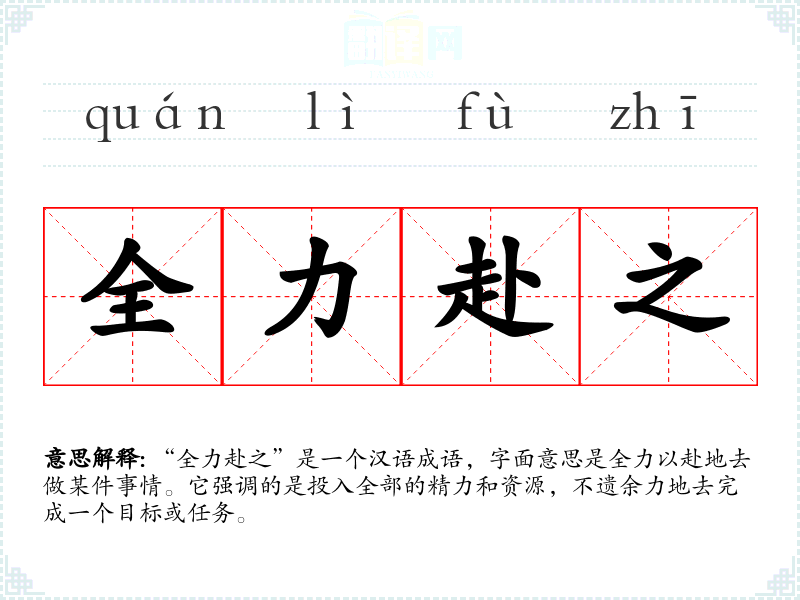 “全力赴之”是一个汉语成语,字面意思是全力以赴地去做某件事情。它强调的是投入全部的精力和资源,不遗余力地去完成一个目标或任务。