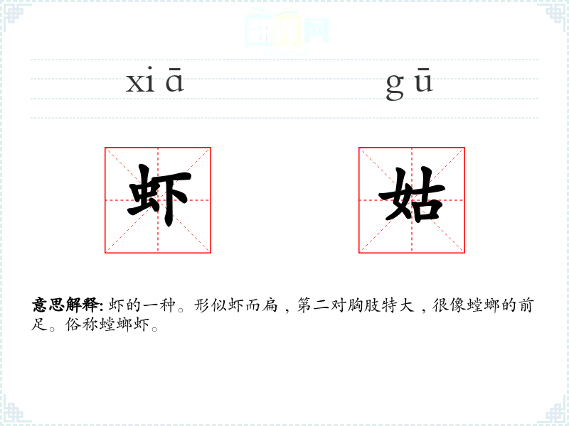 虾的一种。形似虾而扁﹐第二对胸肢特大﹐很像螳螂的前足。俗称螳螂虾。