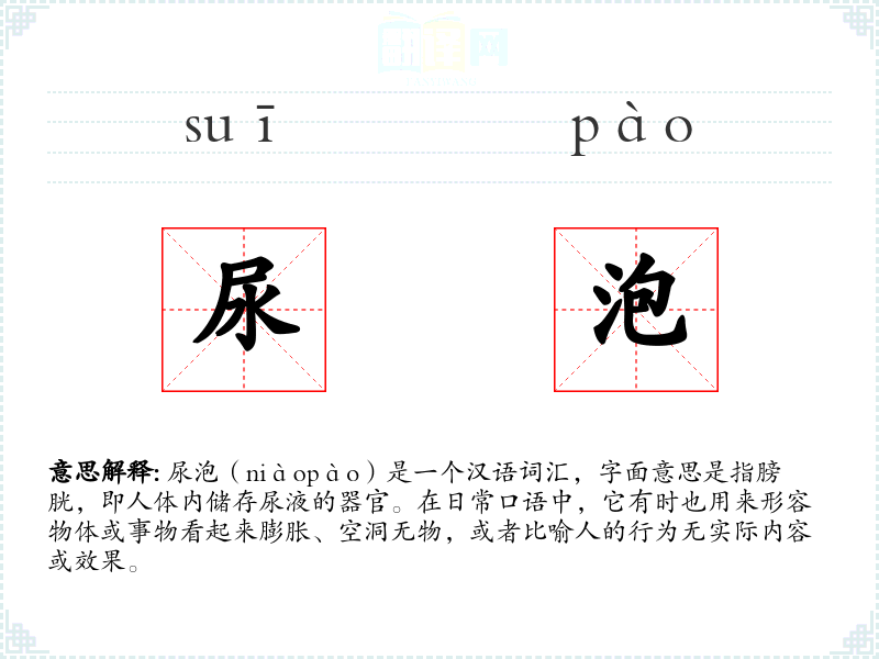 尿泡(niàopào)是一个汉语词汇,字面意思是指膀胱,即人体内储存尿液的器官。在日常口语中,它有时也用来形容物体或事物看起来膨胀、空洞无物,或者比喻人的行为无实际内容或效果。