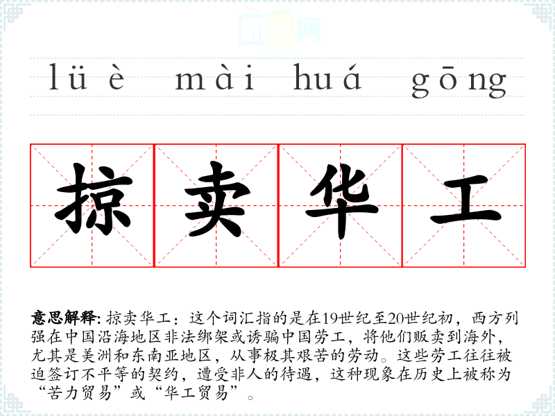 掠卖华工:这个词汇指的是在19世纪至20世纪初,西方列强在沿海地区非法绑架或诱骗劳工,将他们贩卖到海外,尤其是美洲和东南亚地区,从事极其艰苦的劳动。这些劳工往往被迫签订不平等的契约,遭受非人的待遇,这种现象在历史上被称为“苦力贸易”或“华工贸易”。