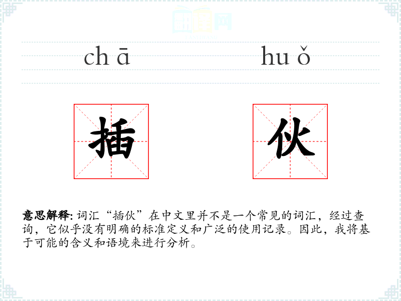 词汇“插伙”在中文里并不是一个常见的词汇,经过查询,它似乎没有明确的标准定义和广泛的使用记录。因此,我将基于可能的含义和语境来进行分析。