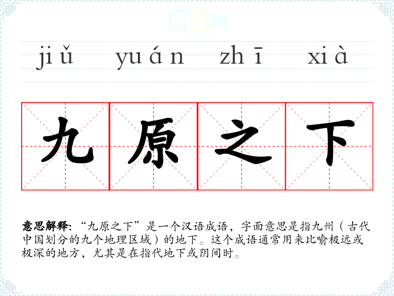 “九原之下”源自古代的地理观念,九原指的是九州,即古代划分的九个大的地理区域。随着时间的推移,这个词汇的含义逐渐扩展,用来比喻地下或阴间。