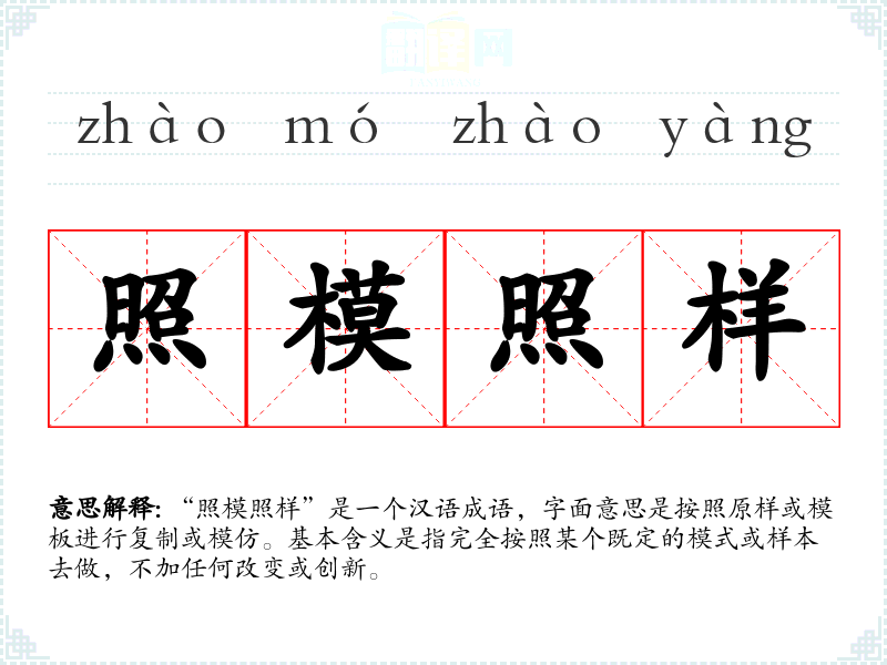“照模照样”是一个汉语成语,字面意思是按照原样或模板进行复制或模仿。基本含义是指完全按照某个既定的模式或样本去做,不加任何改变或创新。