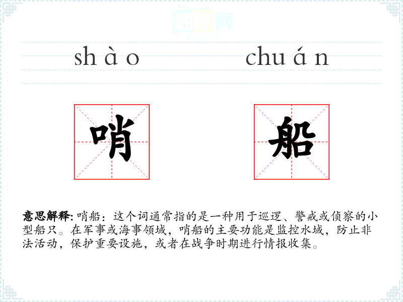 - 反义词:无(因为哨船是一个特定功能的船只,没有直接的反义词)
