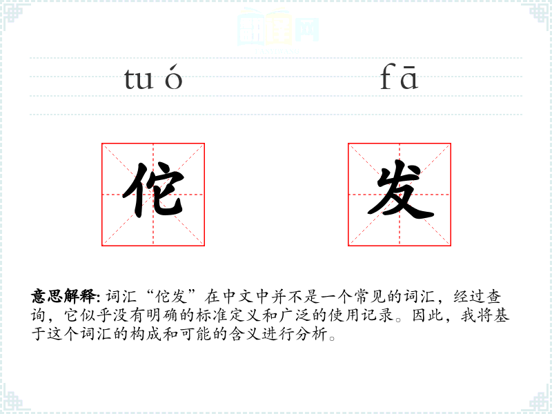 词汇“佗发”在中文中并不是一个常见的词汇,经过查询,它似乎没有明确的标准定义和广泛的使用记录。因此,我将基于这个词汇的构成和可能的含义进行分析。