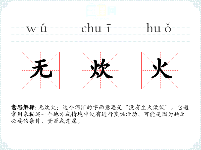 - 口语:在日常对话中,人们可能会用“无炊火”来形容某个地方没有做饭的迹象,比如露营地没有炊火可能意味着没有人居住或活动。