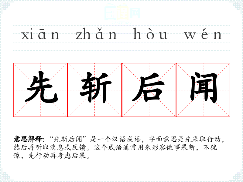 “先斩后闻”是一个汉语成语,字面意思是先采取行动,然后再听取消息或反馈。这个成语通常用来形容做事果断,不犹豫,先行动再考虑后果。