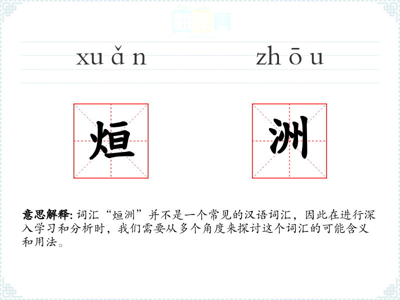 词汇“烜洲”并不是一个常见的汉语词汇,因此在进行深入学习和分析时,我们需要从多个角度来探讨这个词汇的可能含义和用法。