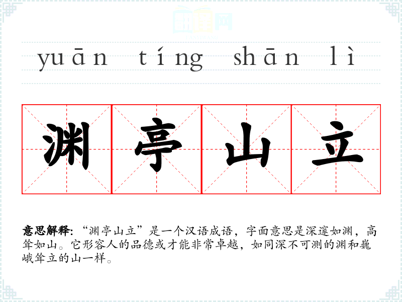 “渊亭山立”这个成语的词源较为模糊,但它显然是由“渊”和“山”两个自然元素构成的,这两个元素在汉语中常用来象征深邃和高大。随着时间的推移,这个成语被用来形容人的品德和才能,成为赞扬他人的一种表达方式。