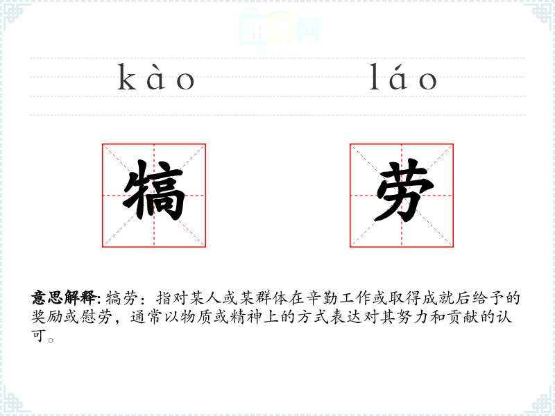 犒劳:指对某人或某群体在辛勤工作或取得成就后给予的奖励或慰劳,通常以物质或精神上的方式表达对其努力和贡献的认可。