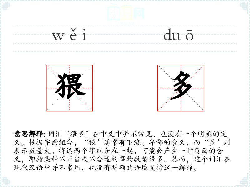 词汇“猥多”在中文中并不常见,也没有一个明确的定义。根据字面组合,“猥”通常有下流、卑鄙的含义,而“多”则表示数量大。将这两个字组合在一起,可能会产生一种负面的含义,即指某种不正当或不合适的事物数量很多。然而,这个词汇在现代汉语中并不常用,也没有明确的语境支持这一解释。