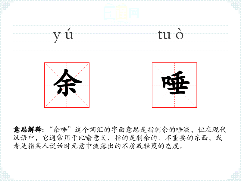 “余唾”这个词汇的字面意思是指剩余的唾液,但在现代汉语中,它通常用于比喻意义,指的是剩余的、不重要的东西,或者是指某人说话时无意中流露出的不屑或轻蔑的态度。