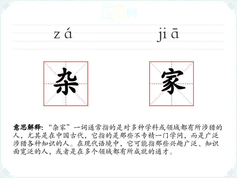 “杂家”一词通常指的是对多种学科或领域都有所涉猎的人,尤其是在**古代,它指的是那些不专精一门学问,而是广泛涉猎各种知识的人。在现代语境中,它可能指那些兴趣广泛、知识面宽泛的人,或者是在多个领域都有所成就的通才。