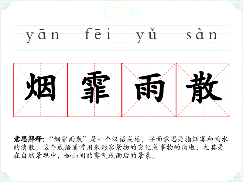 “烟霏雨散”是一个汉语成语,字面意思是指烟雾和雨水的消散。这个成语通常用来形容景物的变化或事物的消逝,尤其是在自然景观中,如山间的雾气或雨后的景象。