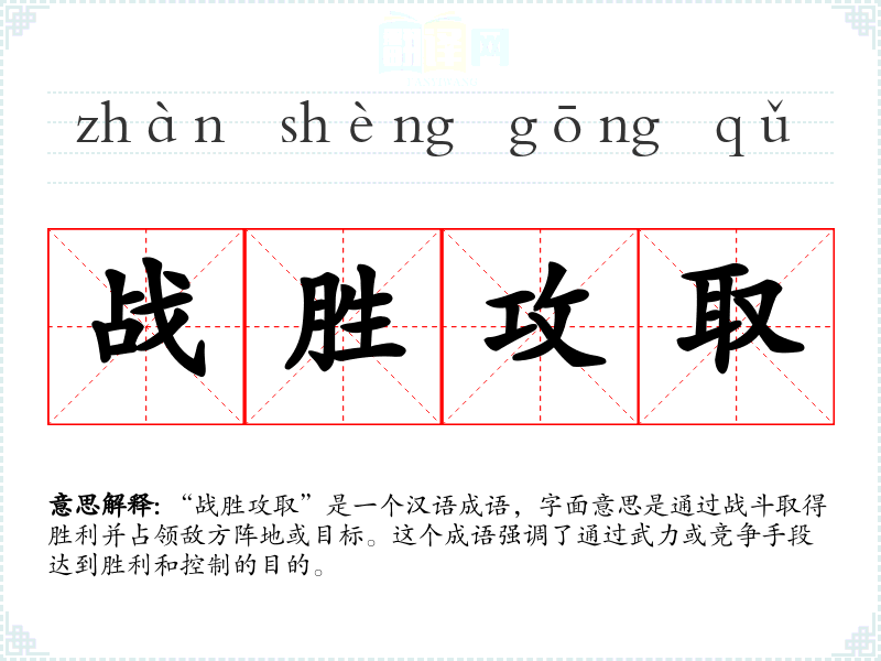 “战胜攻取”是一个汉语成语,字面意思是通过战斗取得胜利并占领敌方阵地或目标。这个成语强调了通过武力或竞争手段达到胜利和控制的目的。