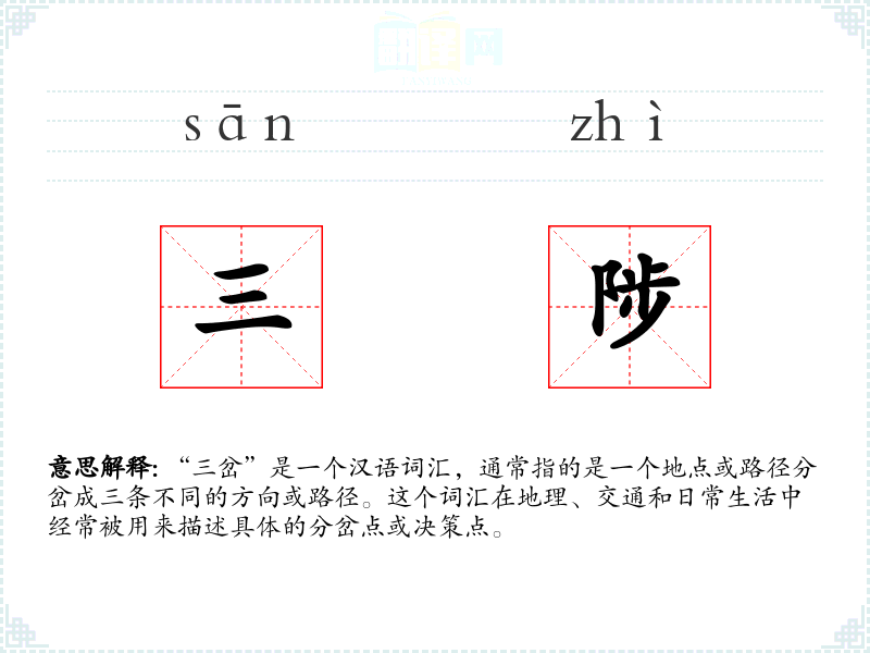 “三岔”是一个汉语词汇,通常指的是一个地点或路径分岔成三条不同的方向或路径。这个词汇在地理、交通和日常生活中经常被用来描述具体的分岔点或决策点。