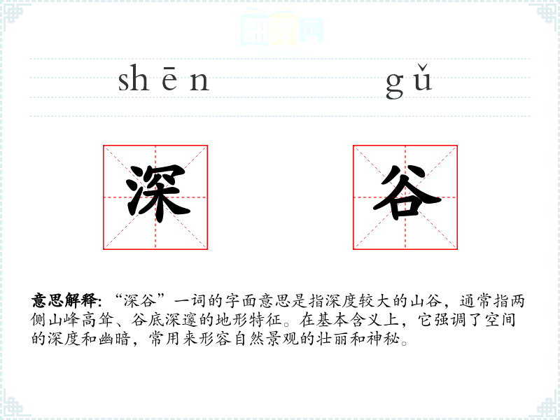 “深谷”一词的词源较为直接,由“深”和“谷”两个字组成。在古代汉语中,“谷”原本指两山之间的水道,后来泛指山谷。随着语言的发展,“深谷”逐渐被用来形容那些深度较大的山谷。