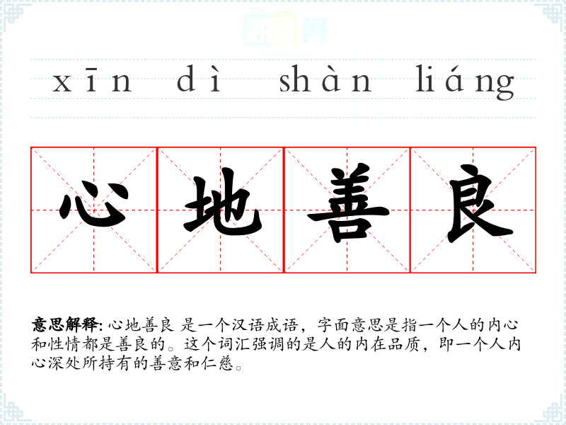 心地善良 是一个汉语成语,字面意思是指一个人的内心和性情都是善良的。这个词汇强调的是人的内在品质,即一个人内心深处所持有的善意和仁慈。
