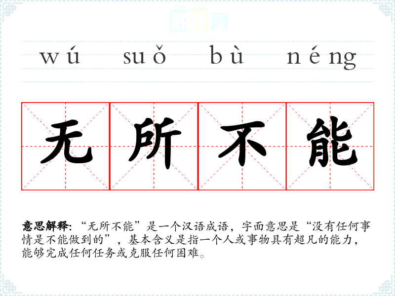 “无所不能”是一个汉语成语,字面意思是“没有任何事情是不能做到的”,基本含义是指一个人或事物具有超凡的能力,能够完成任何任务或克服任何困难。