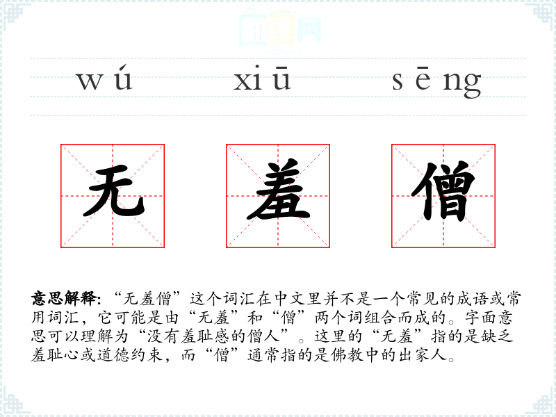 “无羞僧”这个词汇在中文里并不是一个常见的成语或常用词汇,它可能是由“无羞”和“僧”两个词组合而成的。字面意思可以理解为“没有羞耻感的僧人”。这里的“无羞”指的是缺乏羞耻心或道德约束,而“僧”通常指的是**中的出家人。
