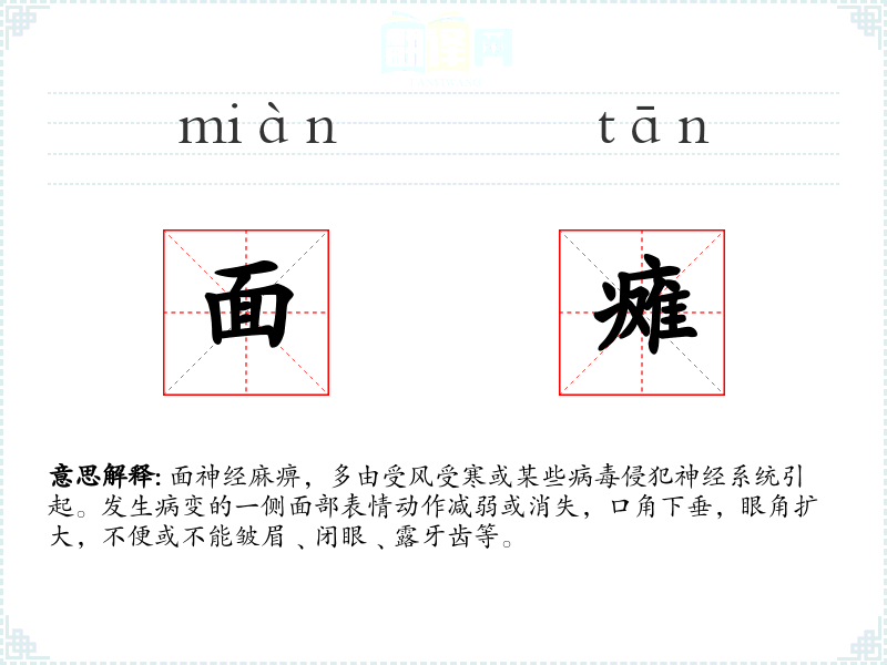 面神经麻痹,多由受风受寒或某些病毒侵犯神经系统引起。发生病变的一侧面部表情动作减弱或消失,口角下垂,眼角扩大,不便或不能皱眉﹑闭眼﹑露牙齿等。