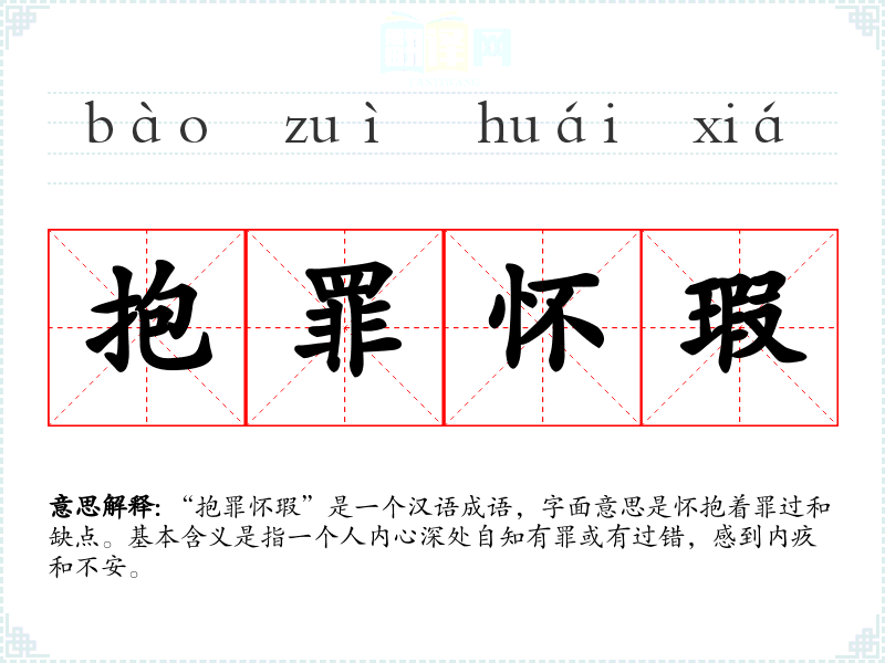 “抱罪怀瑕”是一个汉语成语,字面意思是怀抱着罪过和缺点。基本含义是指一个人内心深处自知有罪或有过错,感到内疚和不安。