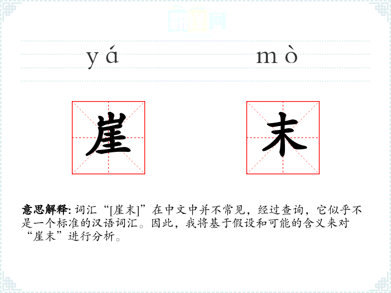 词汇“[崖末]”在中文中并不常见,经过查询,它似乎不是一个标准的汉语词汇。因此,我将基于假设和可能的含义来对“崖末”进行分析。