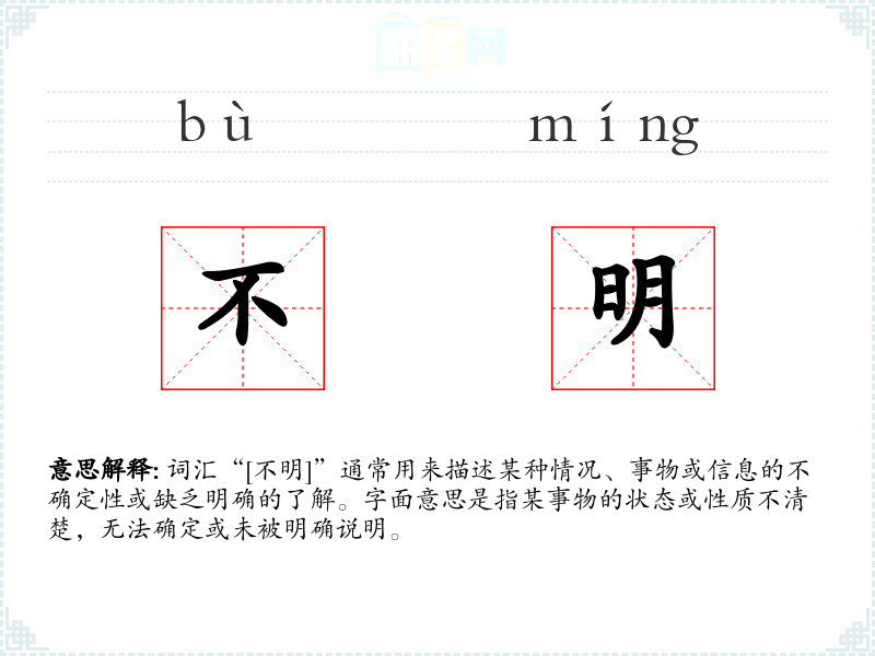 “不明”一词源自汉语,由“不”和“明”两个字组成。在古代汉语中,“明”常指清晰、明白,而“不”则表示否定。随着语言的发展,“不明”逐渐被用来描述各种形式的不确定性。