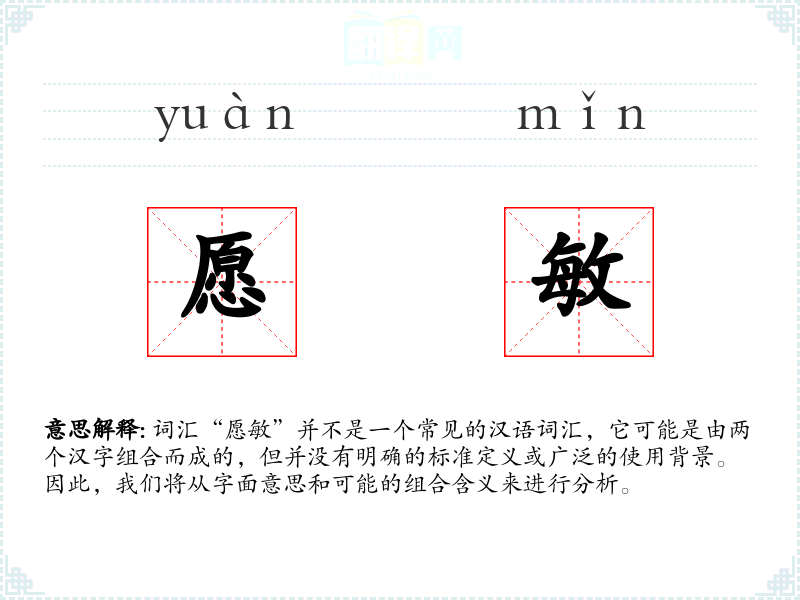 词汇“愿敏”并不是一个常见的汉语词汇,它可能是由两个汉字组合而成的,但并没有明确的标准定义或广泛的使用背景。因此,我们将从字面意思和可能的组合含义来进行分析。
