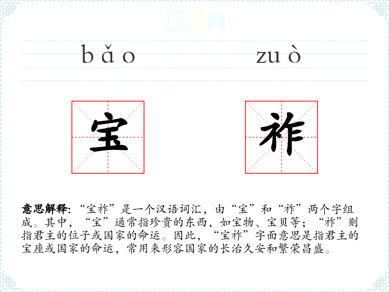 “宝祚”是一个汉语词汇,由“宝”和“祚”两个字组成。其中,“宝”通常指珍贵的东西,如宝物、宝贝等;“祚”则指君主的位子或国家的命运。因此,“宝祚”字面意思是指君主的宝座或国家的命运,常用来形容国家的长治久安和繁荣昌盛。