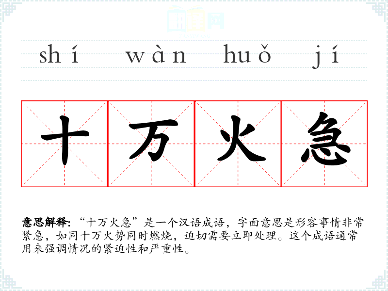 “十万火急”是一个汉语成语,字面意思是形容事情非常紧急,如同十万火势同时燃烧,迫切需要立即处理。这个成语通常用来强调情况的紧迫性和严重性。