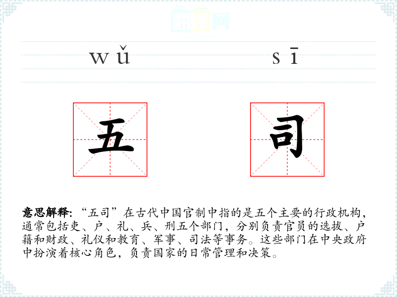 在文学作品中,“五司”可能被用来指代古代政府的组织结构,或者作为一种象征,代表权威和秩序。在口语中,这个词汇可能不太常用,但在历史学、政治学等专业领域,它是一个重要的术语。