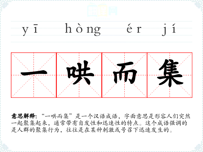 “一哄而集”是一个汉语成语,字面意思是形容人们突然一起聚集起来,通常带有自发性和迅速性的特点。这个成语强调的是人群的聚集行为,往往是在某种刺激或号召下迅速发生的。