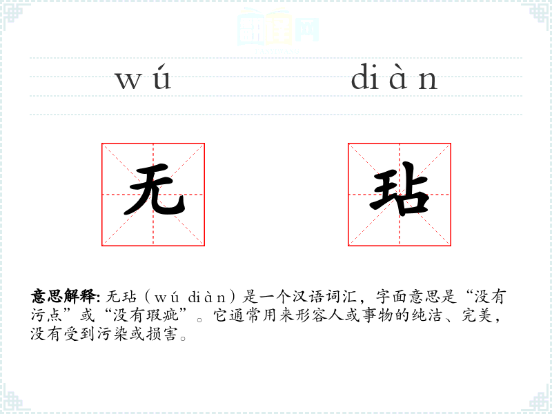 无玷(wú diàn)是一个汉语词汇,字面意思是“没有污点”或“没有瑕疵”。它通常用来形容人或事物的纯洁、完美,没有受到污染或损害。