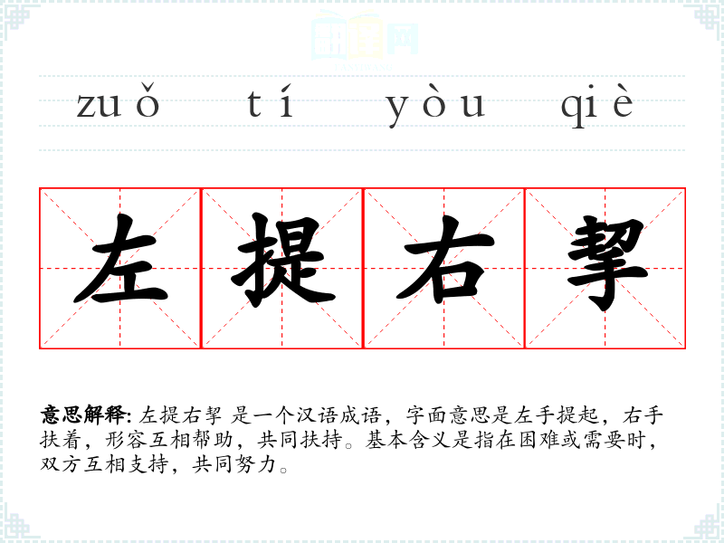 左提右挈 是一个汉语成语,字面意思是左手提起,右手扶着,形容互相帮助,共同扶持。基本含义是指在困难或需要时,双方互相支持,共同努力。