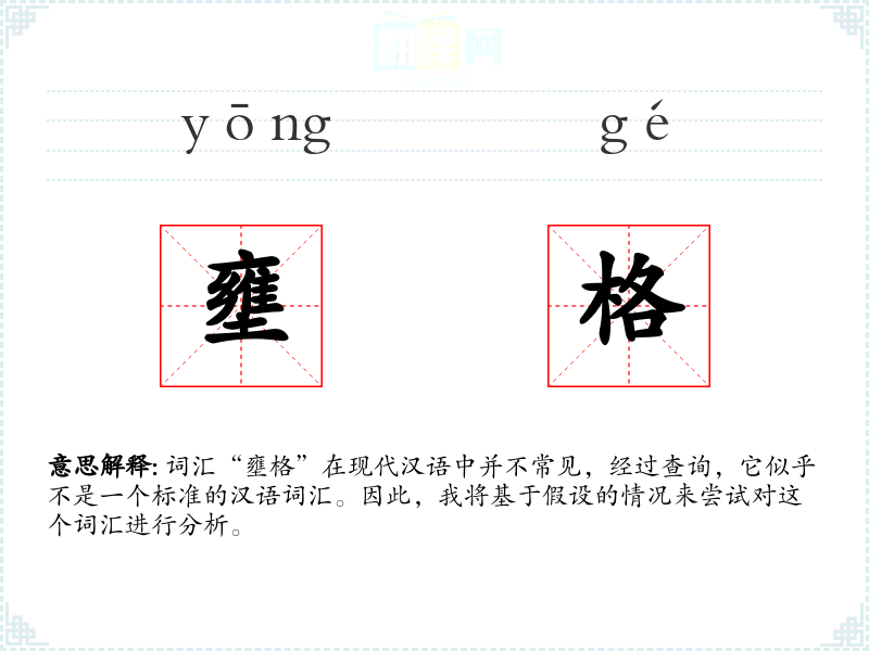 假设“壅格”是一个由“壅”和“格”两个字组成的词汇。其中,“壅”可以指堵塞、阻碍,而“格”通常指格式、标准或框架。结合起来,“壅格”可能指的是一种阻碍或限制的标准或框架。