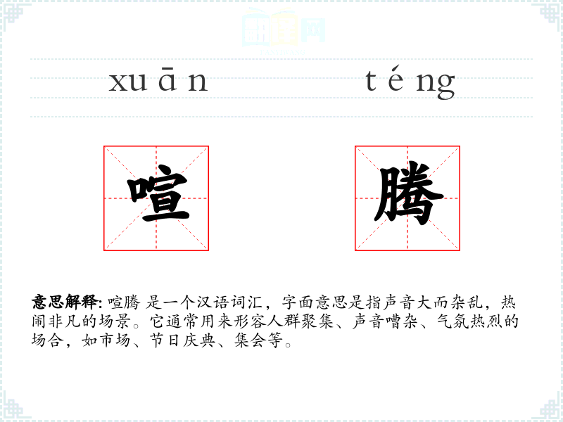 喧腾 是一个汉语词汇,字面意思是指声音大而杂乱,热闹非凡的场景。它通常用来形容人群聚集、声音嘈杂、气氛热烈的场合,如市场、节日庆典、**等。